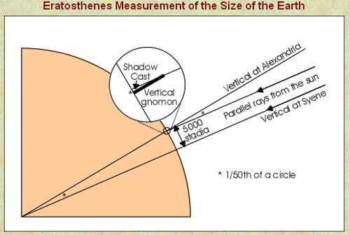 Cùng thời điểm đó năm sau, ông đã đo bóng của một chiếc cọc đặt ở Alexandria (Hy Lạp), và phát hiện ra rằng, ánh nắng mặt trời nghiêng 7 độ so với phương thẳng đứng.