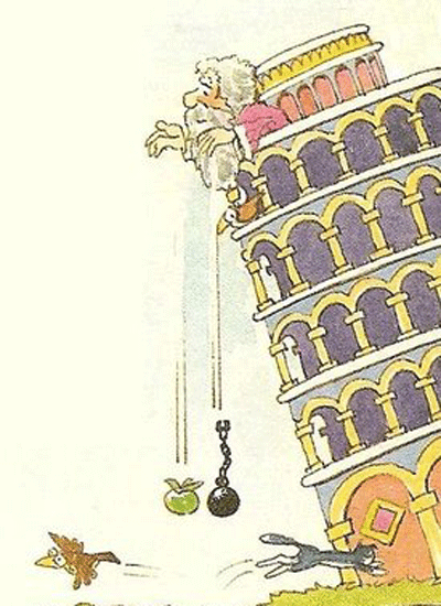 Tuy nhiên Galileo Galilei, một thầy giáo dạy toán ở Đại học Pisa (Italy) lại tin vào điều khác hẳn. Thí nghiệm về vật rơi tự do của ông đã trở thành câu chuyện kinh điển trong khoa học: Ông đã leo lên tháp nghiêng ở Pisa để thả các vật có khối lượng khác nhau xuống đất, và rút ra kết luận là chúng rơi với tốc độ như nhau! (tất nhiên phải bỏ qua sức cản của không khí). Vì kết luận này mà ông đã bị đuổi việc. Ông trở thành tấm gương sáng cho các nhà nghiên cứu sau này, vì đã chỉ ra rằng: Người ta chỉ có thể rút ra kiến thức khoa học từ các quy luật khách quan của thiên nhiên, chứ không phải từ niềm tin.