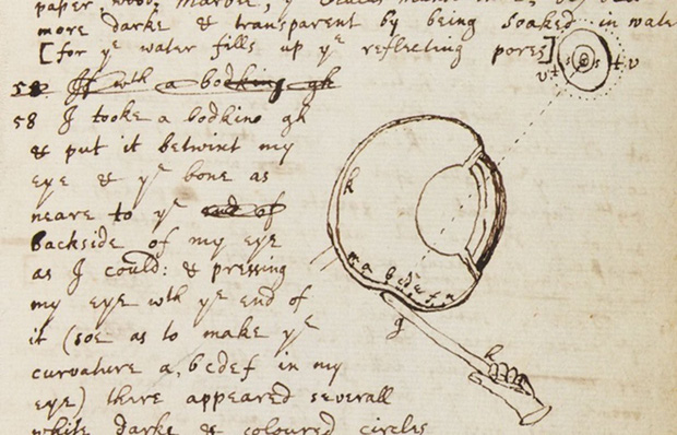 Để thỏa mãn sự tò mò, ông dùng một cái kim xỏ (loại kim tương đối cùn nhưng to và dày, thường được dùng để luồn dây qua quần áo) chọc vào khe giữa cầu mắt và hốc mắt rồi ấn thử. Một tay làm, một tay ghi lại những gì mình quan sát được và đây là ảnh minh họa cùng kết quả thí nghiệm do chính ông viết ra lúc ấy.
