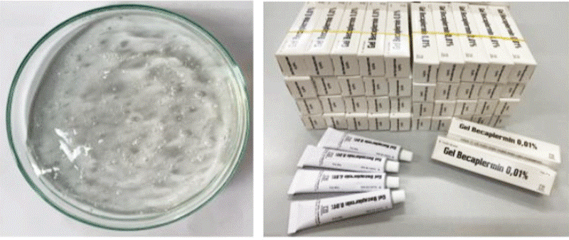 Gel rhPDGF-BB 0.01% (trái) và sản phẩm thuốc thành phẩm Ảnh: NVCC
