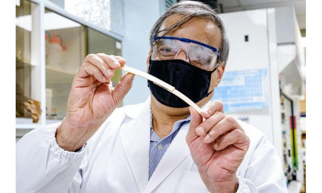 Giáo sư Raju uốn cong hai thanh gỗ được dính lại với nhau bằng keo magnetocuring để chứng minh lực liên kết rất mạnh của nó