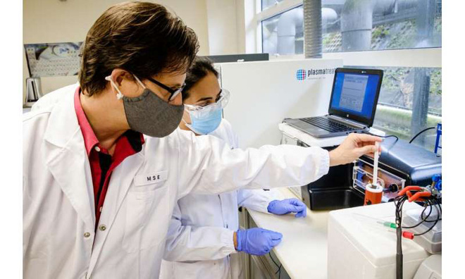 Phó giáo sư Steele và Tiến sỹ Richa đang làm khô cứng keo magnetocuring trong một khối bông gòn bằng trường điện từ