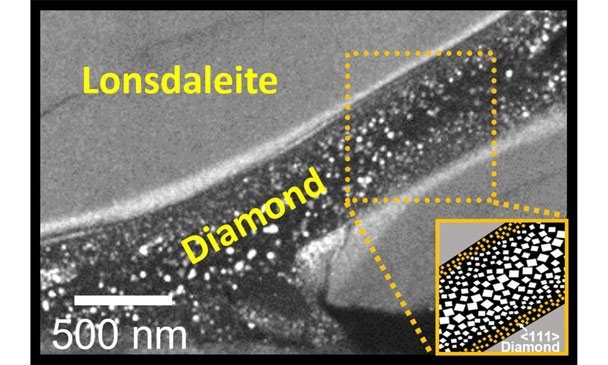Nhiệt độ cực cao và áp suất tạo ra từ vụ va chạm khiến graphite biến thành kim cương nhưng vẫn giữ lại cấu trúc mạng tinh thể lục giác của graphite. Kim cương Lonsdaleite thực ra đã được tổng hợp trong phòng thí nghiệm từ năm 1966 bằng phương pháp nén và đưa graphite lên nhiệt độ cao ở áp suất tĩnh hoặc bằng các vụ nổ. Nó cũng được sản xuát bằng phương pháp lắng đọng hơi hóa học nhưng đây là lần đầu tiên nó được tạo ra ở nhiệt độ phòng.