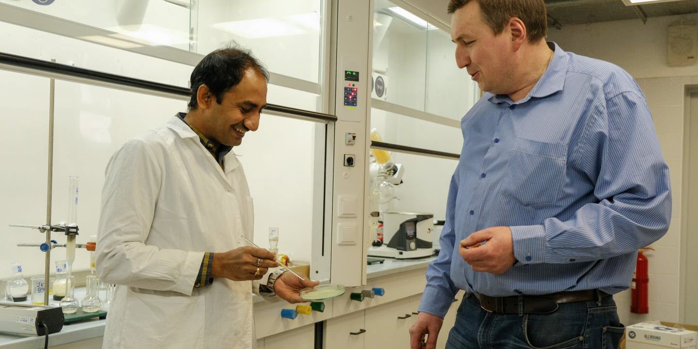 Rammohan Aluru và Grigoriy Zyryanov thuộc nhóm các nhà khoa học đã phát triển màng thực phẩm ăn được dựa trên rong biển (loại bỏ dung dịch axit ferulic và natri alginat trong đĩa Petri).