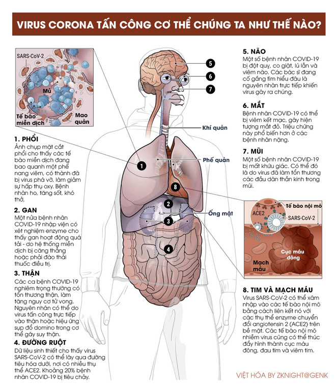 Có 3 loại tế bào chính trong cơ thể chúng ta đang trở thành mục tiêu tấn công của SARS-CoV-2 bao gồm: các tế bào phổi pneumocytes loại II (giúp duy trì phế nang); tế bào ruột enterocytes, giúp cơ thể hấp thụ chất dinh dưỡng; và các tế bào hình đài (goblet) trong đường mũi, có chức năng tiết chất nhầy.