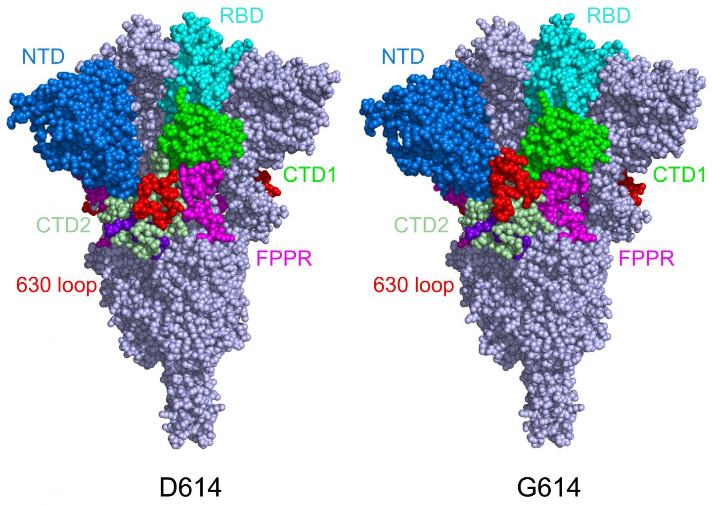 Mô hình này cho thấy cấu trúc của protein đột biến ở dạng đóng kín, dạng D614 ban đầu (bên trái) và dạng đột biến của nó (G614). Trong protein đột biến, vòng 630 (màu đỏ) ổn định