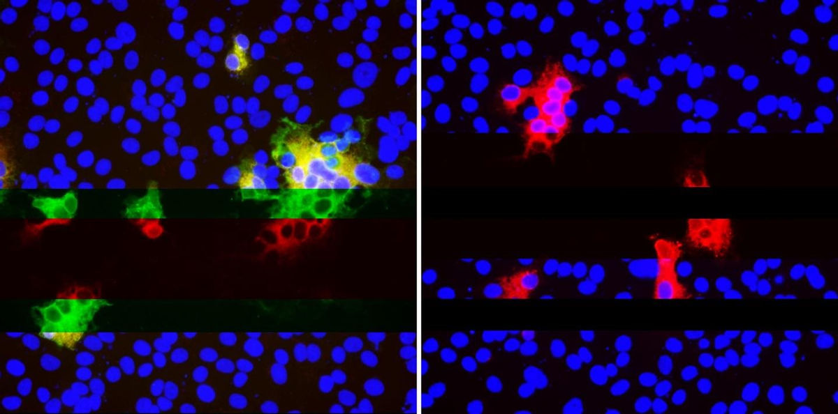 Những kháng thể (xanh lục và đỏ) liên kết với protein spike SARS-CoV-2 trong tế bào (xanh lam) khi không có sự xóa bỏ trong trình tự gene (trái). Sự mất đoạn trong trình tự gene khiến protein spike ngừng gắn kết với kháng thể trung hòa (không có màu xanh lá cây) nhưng những kháng thể khác (màu đỏ) vẫn gắn rất tốt (phải). Sự xóa lặp lại tạo ra các biến thể thoát khỏi kháng thể trung hòa.