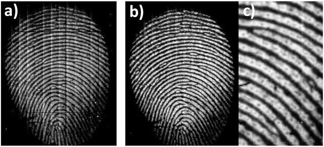 a) Hình ảnh dấu vân tay thu được bằng cảm biến hình ảnh. b) Hình ảnh dấu vân tay sau khi hiệu chỉnh điểm ảnh bù / tăng / sửa pixel phi chức năng. c) Cận cảnh của (b), có thể nhìn thấy rõ các lỗ chân lông.