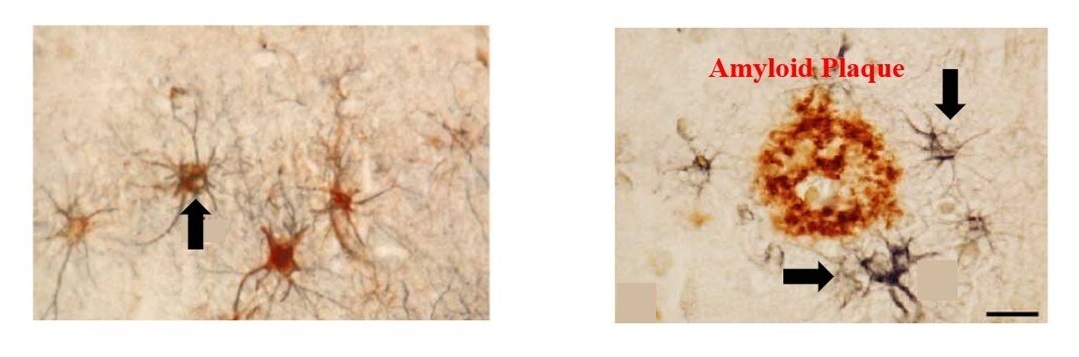 Tế bào hình sao trong não của một bệnh nhân đã qua đời mắc bệnh Alzheimer. (Phải) Các mũi tên màu đen cho thấy các tế bào hình sao bao quanh các mảng amyloid trong não của một bệnh nhân đã qua đời mắc bệnh Alzheimer. Nguồn ảnh: Amit Kumar.