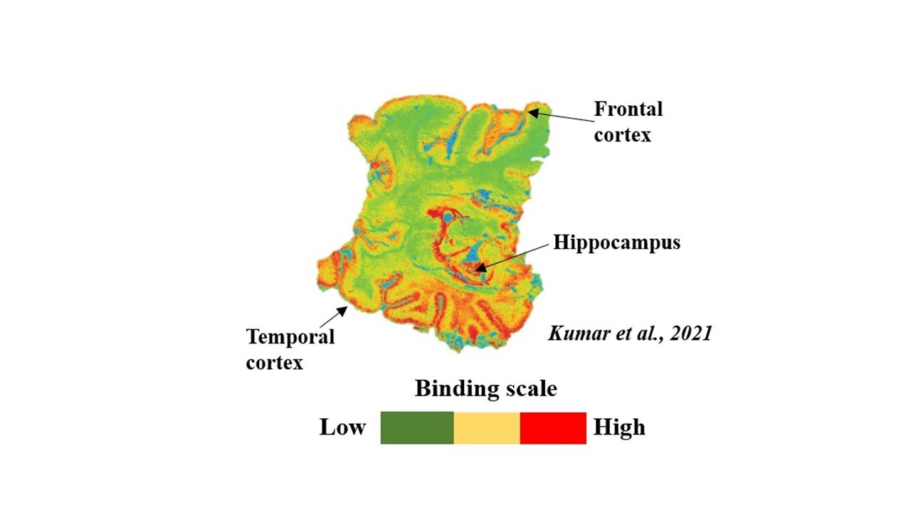 Sự liên kết của chất chỉ thị PET BU99008 cho thấy phản ứng lạc chỗ trong các phần khác nhau của não của một bệnh nhân đã qua đời mắc bệnh Alzheimer. Màu sắc thể hiện mức độ ràng buộc, trong đó màu xanh lá cây là thấp, màu vàng là trung bình và màu đỏ là mức độ ràng buộc cao. Nguồn ảnh: Amit Kumar