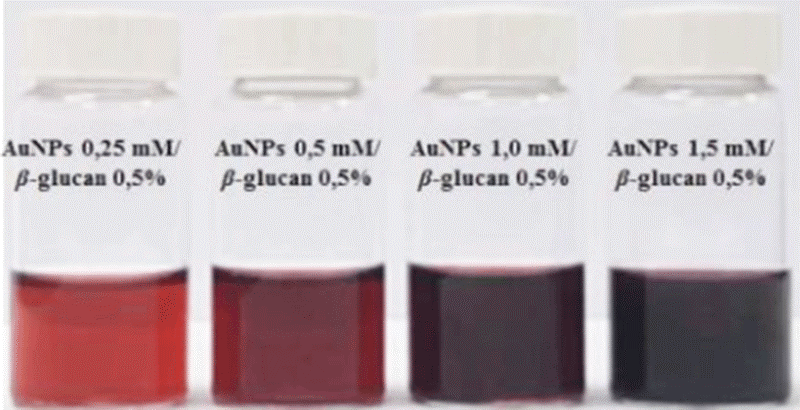 Dung dịch nano vàng AuNPs/ß– glucan ở các nồng độ khác nhau Ảnh: NVCC