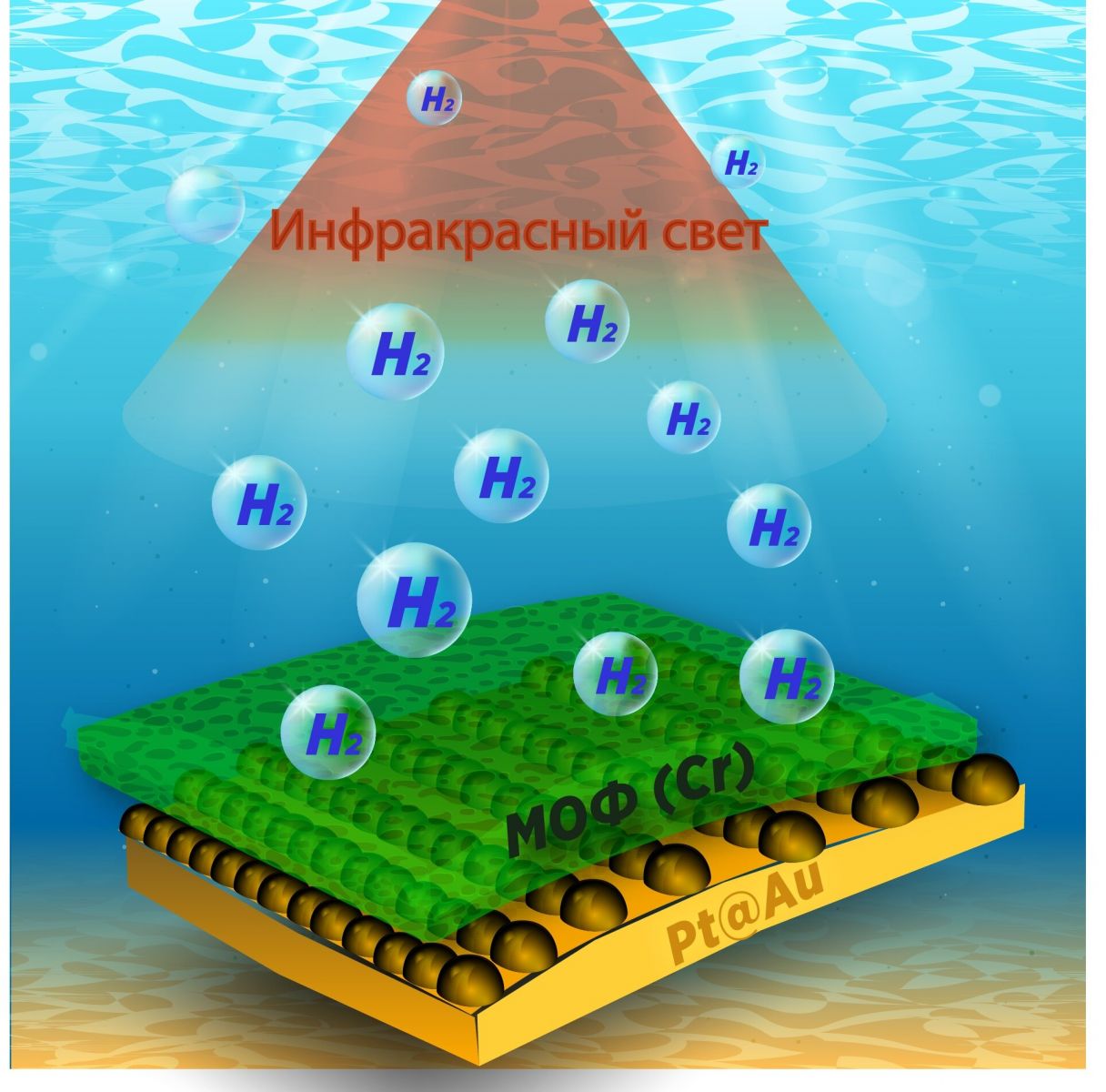 "Trong các thí nghiệm, chúng tôi tưới vật liệu và niêm phong thùng chứa, lấy mẫu khí định kỳ để xác định lượng hydro. Ánh sáng hồng ngoại gây ra sự kích thích cộng hưởng plasmon trên bề mặt mẫu. Các electron nóng được tạo ra trên màng vàng được chuyển sang lớp bạch kim. Những electron này đã kích hoạt để khử các proton ở giao diện với lớp hữu cơ. Các electron này cũng có thể được sử dụng để giảm proton và thu được hydro", Guselnikova giải thích.