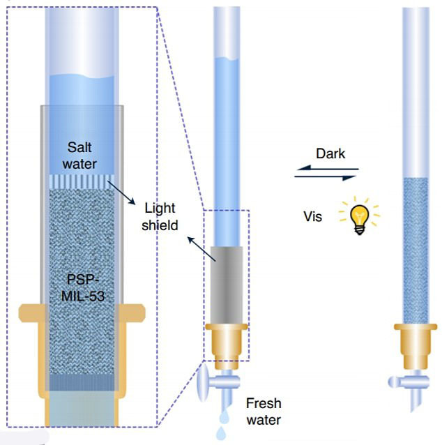 Trong quá trình khử muối, bước đầu, một bộ lọc MOF chuyên dụng sẽ tách hoàn toàn muối từ nước biển, quy trình này không tiêu thụ năng lượng. Sau đó, bộ lọc MOF sẽ được đưa ra dưới ánh nắng mặt trời trực tiếp trong chưa đầy 4 phút để tái tạo chức năng trước khi được đưa trở lại để thực hiện quy trình tách muối thêm một lần nữa.