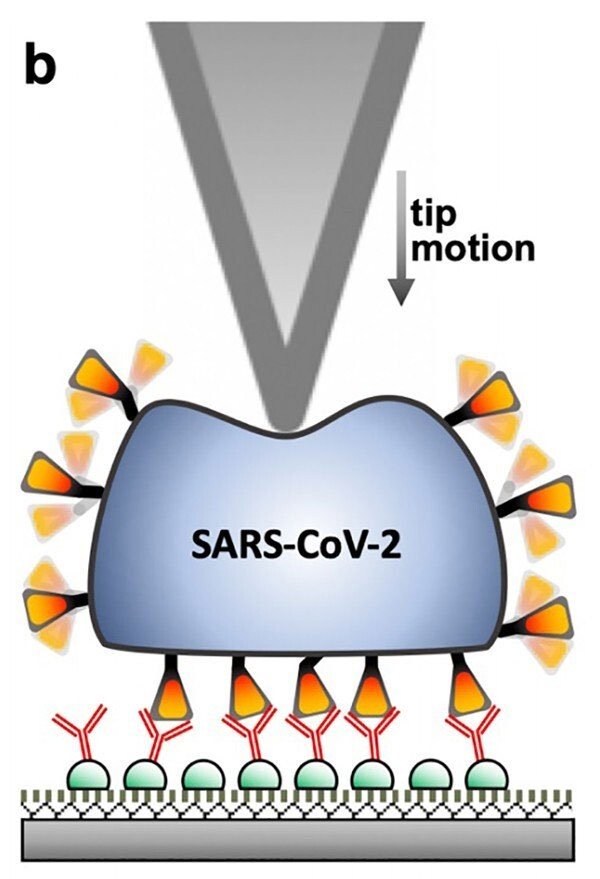 Vật liệu này có thể cố định virus tại vị trí. Dưới kính hiển vi lực nguyên tử phát ra tia laze, các nhà khoa học dùng kim chọc dò virus để xem nó phản ứng với các kích thích khác nhau như thế nào.