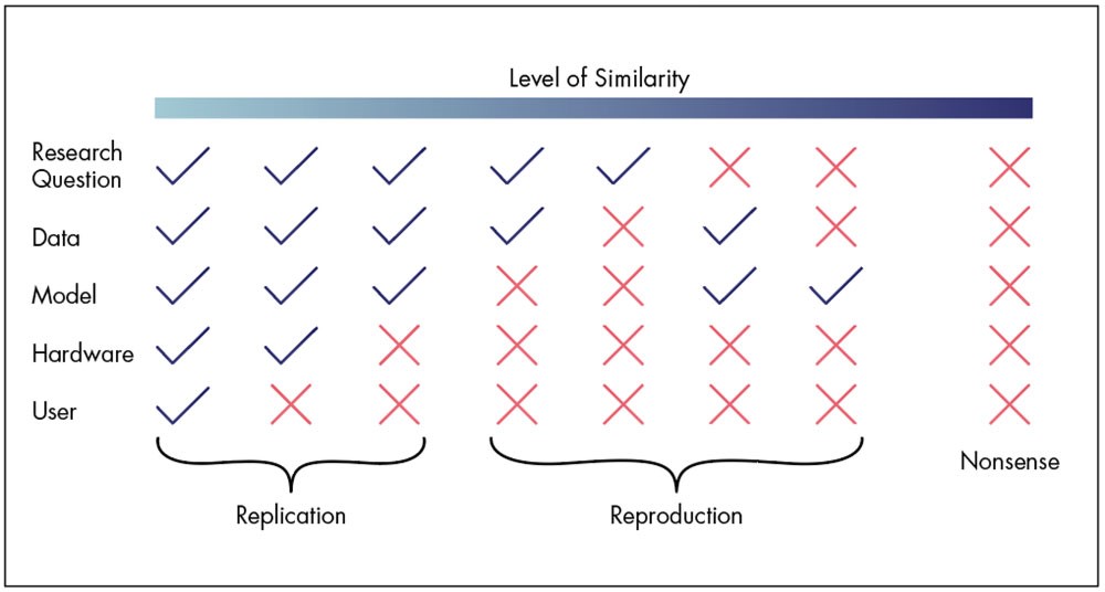 Để có khả năng lặp lại, các kết quả cần tuân theo các quy trình giống nhau và kiểm soát những gì có thể được kiểm soát một cách hợp lý. Độ lặp lại không có nghĩa là kết quả hoàn toàn giống hệt nhau. Các yếu tố ngẫu nhiên vẫn sẽ ảnh hưởng đến kết quả. Do đó vẫn cần phải có hiểu biết về thống kê và độ không đảm bảo đo. Khả năng lặp lại cũng khác với sao chép. Sao chép là một nỗ lực lặp lại một thử nghiệm giống hệt nhau. Hình 1 cho thấy trình bày của Zach Scott về khả năng sao chép và khả năng lặp lại.