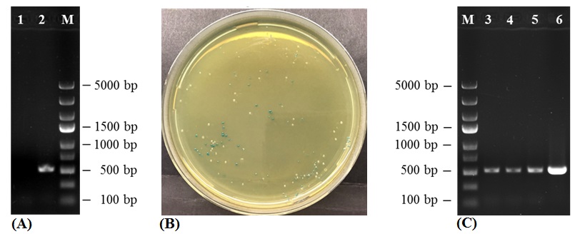 Hình 1. Kết quả PCR và tạo dòng. (A) Giếng 1 là đối chứng âm, giếng 2 là sản phẩm PCR gene BPSS1498 khuếch đại từ DNA khuôn của chủng B. pseudomallei NA23. (B) Tạo dòng vi khuẩn E. coli DH5α màu trắng mang plasmid pPSG-IBA3 chứa gene BPSS1498. (C) Kết quả PCR gene BPSS1498 khuếch đại trực tiếp từ các khuẩn lạc E. coli DH5α màu trắng.