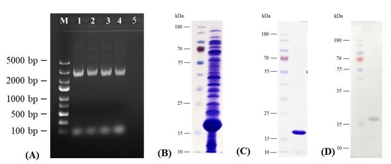Hình 2. Kết quả tách plasmid pPSG-IBA3::BPSS1498 (A), biểu hiện protein hcp1 sử dụng E. coli BL21(DE3) pLysS (B), tinh sạch protein hcp1 (C) và chạy western blot protein hcp1 với huyết thanh bệnh nhân nhiễm melioidosis (D).