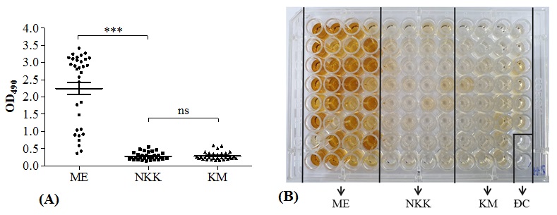 Hình 3. Đồ thị kết quả hcp1-ELISA (A) và hình ảnh đĩa hcp1-ELISA (B). Nhóm bệnh nhân melioidosis (ME), nhóm bệnh nhân nhiễm khuẩn huyết khác (NKK) và nhóm người khỏe mạnh (KM).