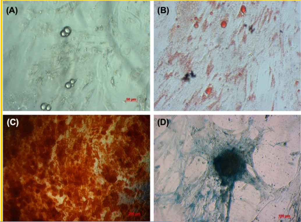 Tế bào gốc dây rốn được biệt hóa thành công thành tế bào mỡ, nguyên bào xương. Ảnh: Nhóm NC.
