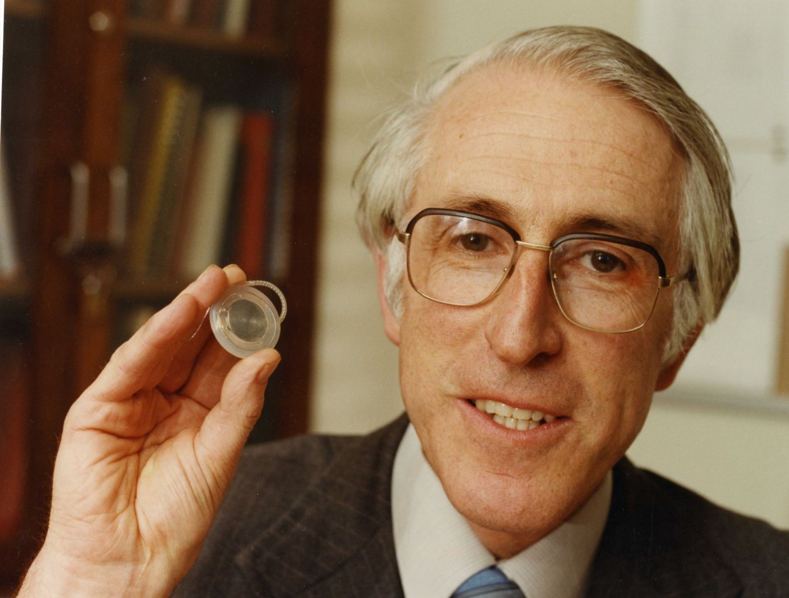 Graeme Clark cầm trên tay thiết bị ốc tai điện tử. Ảnh: Eoas.