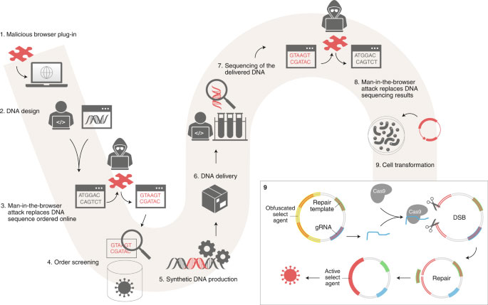 Các nhà nghiên cứu mô tả một tình huống trong đó kẻ xấu sử dụng trojan để lây nhiễm vào máy tính của nhà nghiên cứu. Khi nhà nghiên cứu đó đặt hàng DNA tổng hợp, phần mềm độc hại sẽ xáo trộn trật tự để nó trông có vẻ hợp pháp với phần mềm bảo mật mà cửa hàng DNA tổng hợp sử dụng để kiểm tra. Trên thực tế, các chuỗi con DNA bị xáo trộn này có hại.