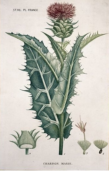Hình vẽ cây cỏ sữa Silybum marianum, loài cây có hoạt chất Silymarin, từ bộ sưu tập thực vật của Bảo tàng Lịch sử tự nhiên London.