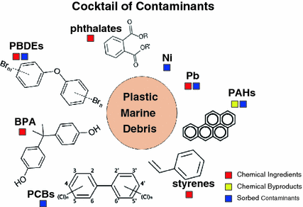 Tập hợp các chất gây ô nhiễm của các mảnh vụn nhựa. Các chất ô nhiễm liên quan đến các mảnh vụn nhựa là các thành phần hóa học (hình vuông màu đỏ), sản phẩm phụ của quá trình sản xuất (hình vuông màu vàng) và những chất tích tụ trong môi trường nước ( hình vuông màu xanh).