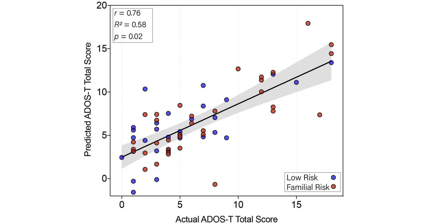Mối tương quan giữa điểm số thực tế và điểm dự đoán từ ADOS-T, một công cụ đánh giá được các bác sĩ và nhà nghiên cứu sử dụng để đánh giá giao tiếp xã hội và các hành vi lặp đi lặp lại liên quan đến ASD ở trẻ nhỏ.