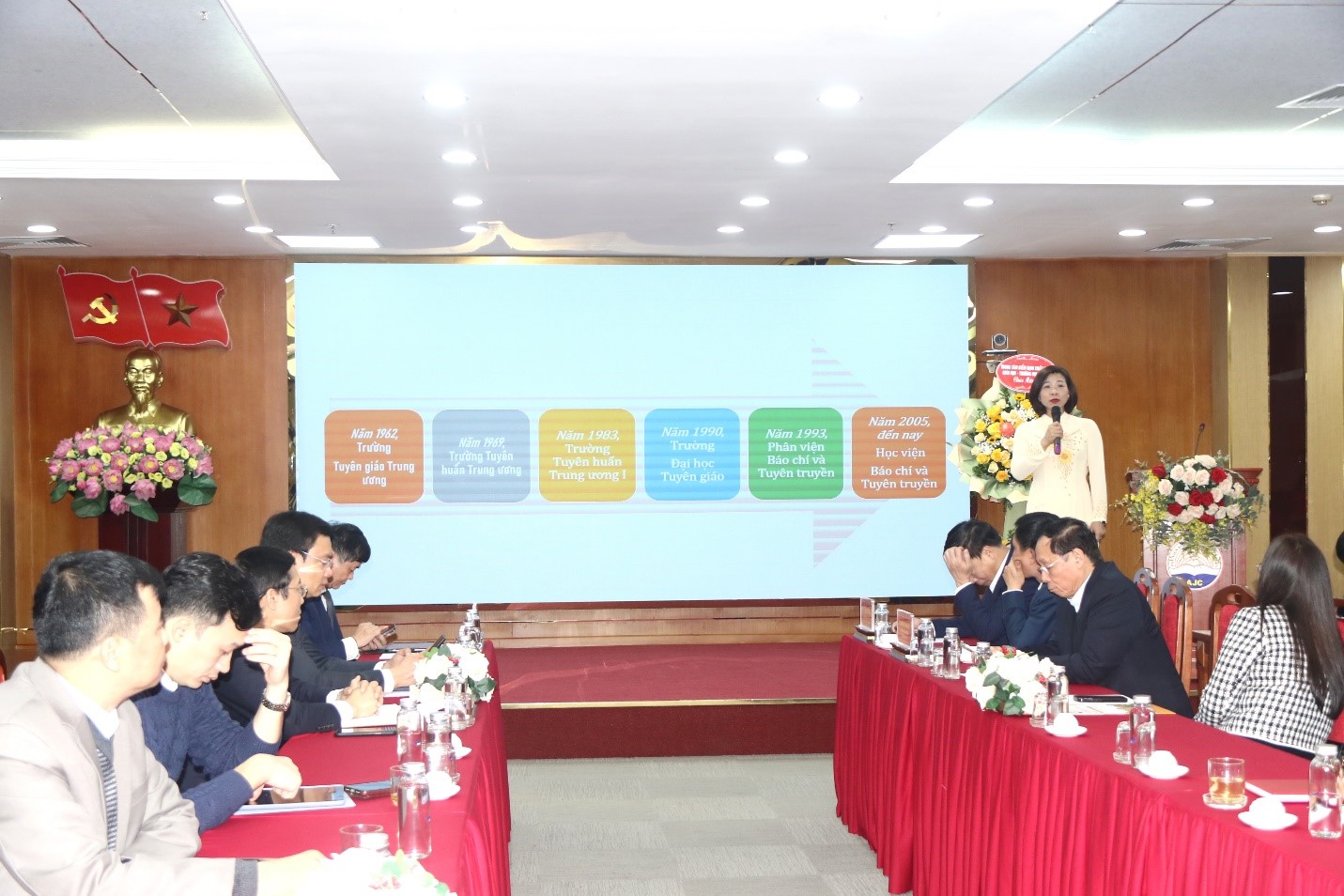 Phía Học viện Báo chí và Tuyên truyền có: PGS,TS. Mai Đức Ngọc, Bí thư Đảng ủy, Chủ tịch Hội đồng trường; PGS,TS. Phạm Minh Sơn, Phó Bí thư Đảng ủy, Giám đốc Học viện; các đồng chí trong Ban lãnh đạo cùng đại diện các đơn vị, tổ chức, đoàn thể; đại diện cán bộ, giảng viên, sinh viên và học viên của Học viện.