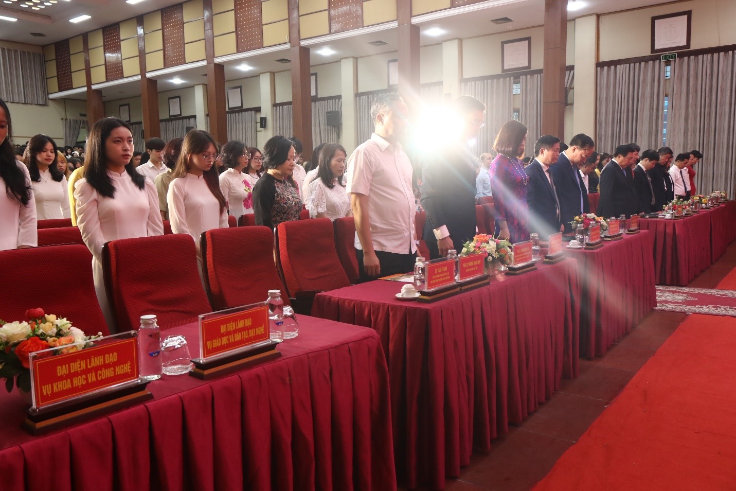 Các đại biểu dành một phút tưởng niệm các nạn nhân gặp tai nạn trong vụ cháy chung cư mini ở Hà Nội, trong đó có tân sinh viên K43 của Học viện Báo chí và Tuyên truyền