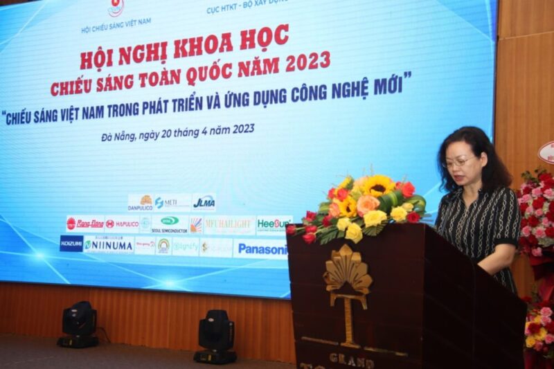Bà Đặng Anh Thư, Phó cục trưởng Cục Hạ tầng Kỹ thuật (Bộ Xây dựng) phát biểu tại hội nghị khoa học chiếu sáng toàn quốc năm 2023.