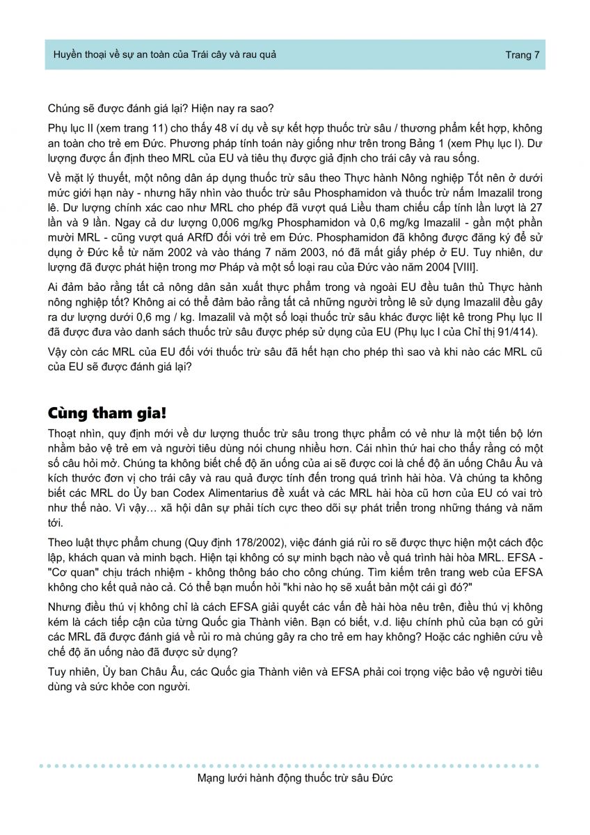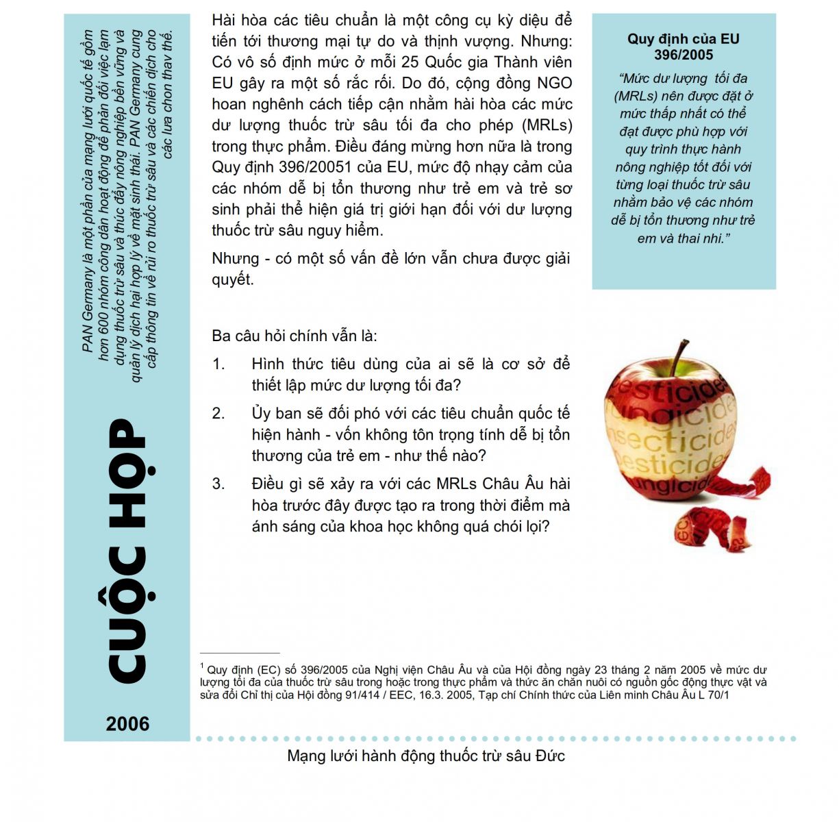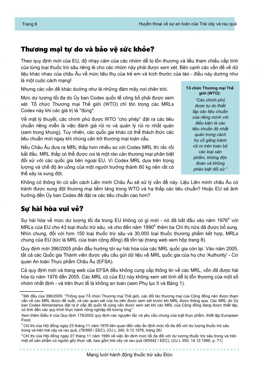 TNNN - Báo cáo tóm tắt này có mục đích nâng cao nhận thức trong xã hội dân sự về thực tế rằng quá trình hiện tại của EU về việc hài hòa hóa mức độ thuốc trừ sâu trong thực phẩm cho thấy một cơ hội để giảm rủi ro hóa chất. Tuy nhiên, nếu xã hội dân sự không tham gia vào việc này với tư cách là cơ quan giám sát tích cực, chúng ta có thể sớm phải đối mặt với mức thuốc trừ sâu chỉ phục vụ thương mại tự do và lợi ích của các ngành công nghiệp - bỏ qua các nhóm dễ bị tổn thương.