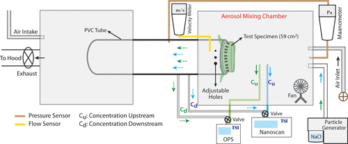 Sơ đồ thiết lập thí nghiệm. Một bình xịt NaCl polydisperse được đưa vào buồng trộn, nơi nó được trộn và đưa qua vật liệu đang được thử nghiệm (thử nghiệm mẫu vải làm khẩu trang). Mẫu thử được giữ đúng vị trí bằng kẹp để được ghi nhận tốt hơn. Bình xịt được lấy mẫu trước (ngược dòng, Cu ) và sau (xuôi dòng, Cd ) khi đi qua mẫu thử. Chênh lệch áp suất được đo bằng áp kế, và tốc độ dòng khí dung được đo bằng máy đo vận tốc. Các nhà khoa học sử dụng hai lỗ tròn có đường kính 0,635 cm để mô phỏng ảnh hưởng của các khoảng trống đến hiệu quả lọc. Các sol khí và nồng độ hạt được lấy mẫu được phân tích bằng máy phân tích hạt (OPS và Nanoscan). Kết quả được sử dụng để xác định hiệu quả của bộ lọc.