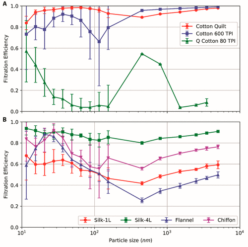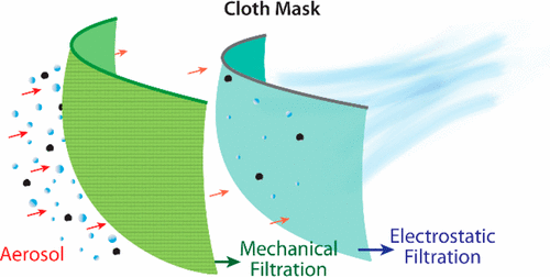 Một máy đếm hạt đã được sử dụng để xác định số hạt khí dung xuyên qua các lớp vải. Kết quả cho thấy, khi kết hợp một lớp cotton với hai lớp vải poly-spandex chiffon (loại vải thường được sử dụng trong trang phục dạ hội), khẩu trang có thể lọc 80 - 99% các hạt khí dung tùy thuộc vào kích thước của chúng. Sự kết hợp giữa vải cotton với lụa tự nhiên hoặc vải flanen cũng cho kết quả tương tự.