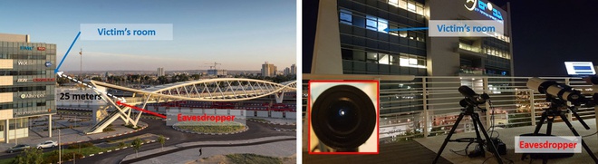 Trong thí nghiệm nghe lén, ống kính viễn vọng và bộ cảm biến quang điện được đặt cách xa phòng đối tượng khoảng 25 m. Ảnh: Wired.