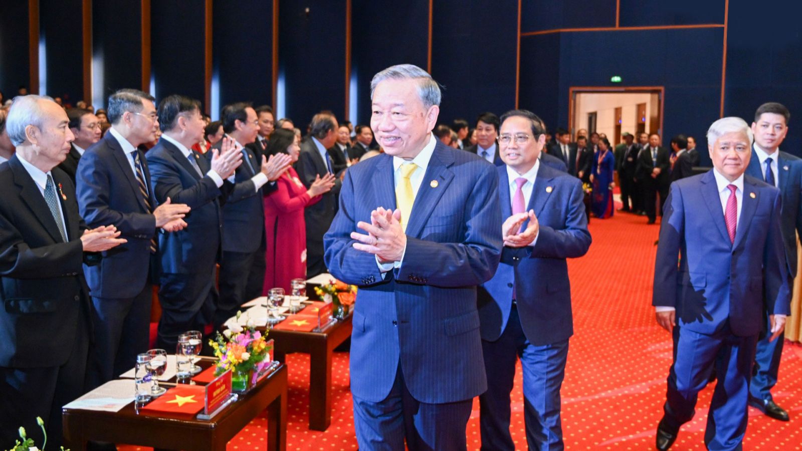 Với niềm vui mừng, xúc động, Đại hội đã trân trọng kính mời đồng chí Tô Lâm, Tổng Bí thư Ban chấp hành Trung ương Đảng Cộng sản Việt Nam, Chủ tịch nước cộng hòa xã hội chủ nghĩa Việt Nam; đồng chí Phạm Minh Chính, Ủy viên Bộ chính trị, Thủ tướng Chính phủ nước cộng hòa xã hội chủ nghĩa Việt Nam; đồng chí Trần Thanh Mẫn, Ủy viên Bộ chính trị, Chủ tịch Quốc hội nước cộng hòa xã hội chủ nghĩa Việt Nam; đồng chí Lương Cường, Ủy viên Bộ chính trị, Thường trực Ban bí thư Trung ương Đảng Cộng sản Việt Nam lên vị trí danh dự của Đoàn Chủ tịch Đại hội để chỉ đạo Đại hội.