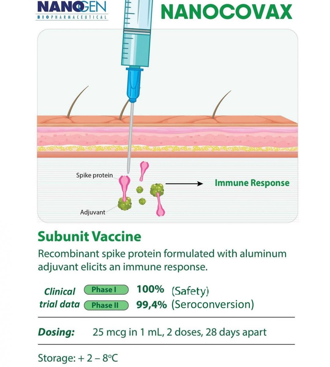 Nanocovax là vaccine tiểu đơn vị chứa kháng nguyên gai (S) SARS-CoV-2 tái tổ hợp, bản chất là protein S, có vai trò kích thích sinh miễn dịch kháng virus SARS-CoV-2.