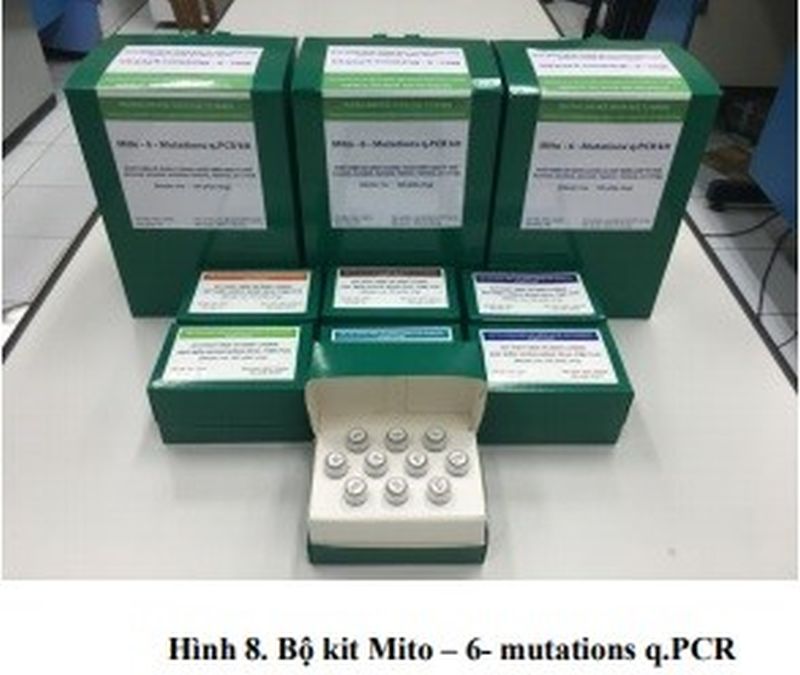 - Đã sản xuất được 12 bộ kit real-time PCR phát hiện và định lượng đột biến A3243G, G3380A, A8344G, T8993C, T8993G, G11778A (mỗi đột biến gồm 2 bộ kit và 100 phản ứng/bộ). 6 bộ kit tương ứng với 6 đột biến đã được đóng gói thành 01 bộ kit lớn để phát hiện và định lượng được cả 6 đột biến trong cùng một điều kiện phản ứng và được đặt tên là Mito-6-mutations q.PCR. Bộ kit Mito-6-mutations q.PCR cho phép phát hiện và định lượng 6 đột biến với mẫu chuẩn và mẫu mù cũng như đạt được các tiêu chuẩn cơ sở cho kit real-time PCR, với độ đặc hiệu 100% và độ nhạy 1%.