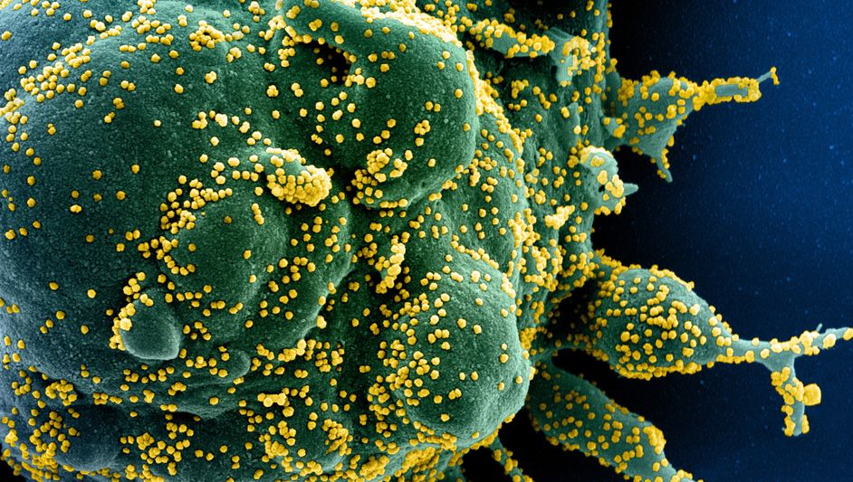 Tế bào bị lây nhiễm (màu xanh) với mầm bệnh Sars-CoV-2 (vàng).