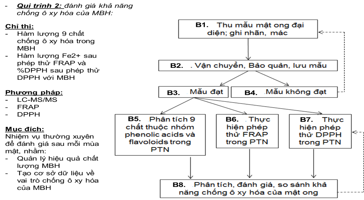 Về chỉ thị đánh giá khả năng chống ô xy hóa của MBH, hàm lượng 9 chất chống ô xy hóa phổ biến trong mật ong bằng Sắc ký lỏng ghép đầu dò khối phổ khối phổ kép LC-MS/MS XEVO TQ-S (Waters) cho phép xác định khả năng chống ô xy hóa tổng số bằng phép thử FRAP và DPPH.