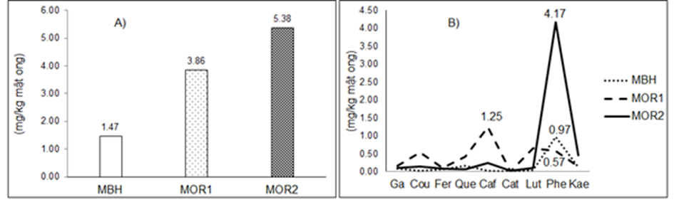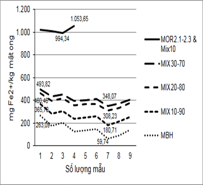 Hàm lượng Fe2+ (55,23-263,89 mg/kg; TB: 147,60mg/kg±61,76) do MBH, thấp hơn của mật nhãn (MOR1) và MOR2 từ 4,4-6,8 lần và %DPPH (10,02-16,93%; TB: 13,38%±) 2,63), thấp hơn của MOR1 và MOR2 từ 1,6-2,1 lần (0,02