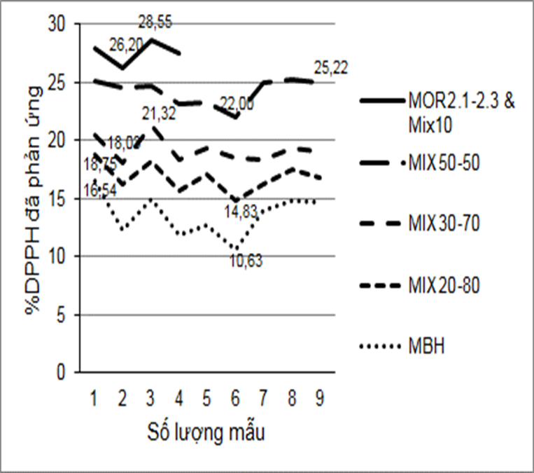 Giao động về phần trăm DPPH đã phản ứng sau phép thử DPPH giữa các loại nền mẫu: MOR2 nguyên chất&MIX10, MIX50-50, MIX30-70, MIX20-80 và MBH nguyên chất