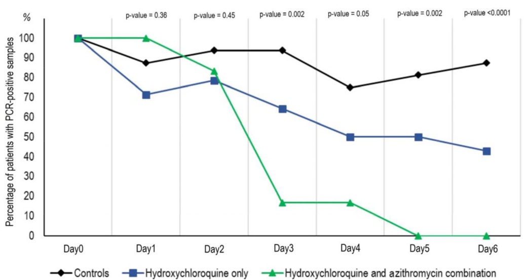 14 bệnh nhân còn lại được uống 3 lần mỗi ngày thuốc hydroxychloroquine 200mg, uống trong 10 ngày. Thêm vào đó, 6 người trong số họ được uống azithromycin 500mg trong 2 ngày đầu tiên, azithromycin 250mg trong 4 ngày sau đó, để chống bội nhiễm. Cả 6 bệnh nhân đều dung nạp hỗn hợp hydroxychloroquine và azithromycin rất tốt.