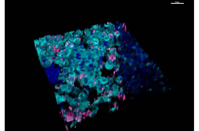 Hình ảnh 3D về di căn ung thư vú ở người cho thấy sự hình thành của bào quan mới được mô tả (màu đỏ tươi) trong tế bào ung thư (màu lục lam). Nhân tế bào ung thư và tế bào xương bình thường đều có màu xanh lam. Hình ảnh kết xuất của Mark Esposito và Gary Laevsky.
