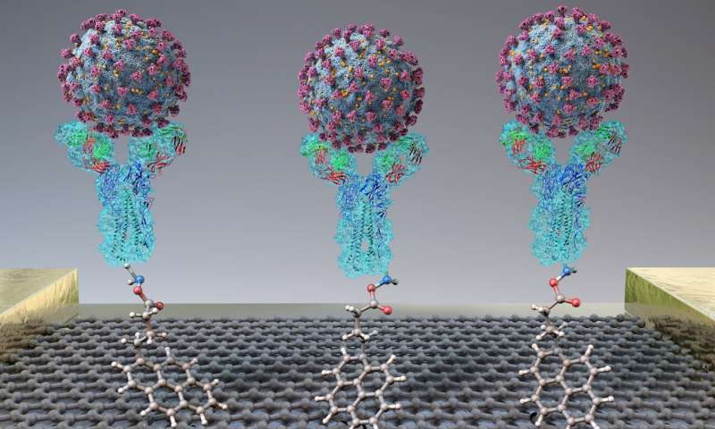 Cụ thể, nhóm nghiên cứu đã thiết kế xét nghiệm dựa trên transistor hiệu ứng trường, một tấm graphene có tính dẫn điện cao. Họ gắn kháng thể chống protein hình gai của Sars-CoV-2 vào graphene. Khi họ thêm protein hình gai hoặc Sars-CoV-2 nuôi cấy vào cảm biến, liên kết với kháng thể tạo ra thay đổi trong dòng điện.