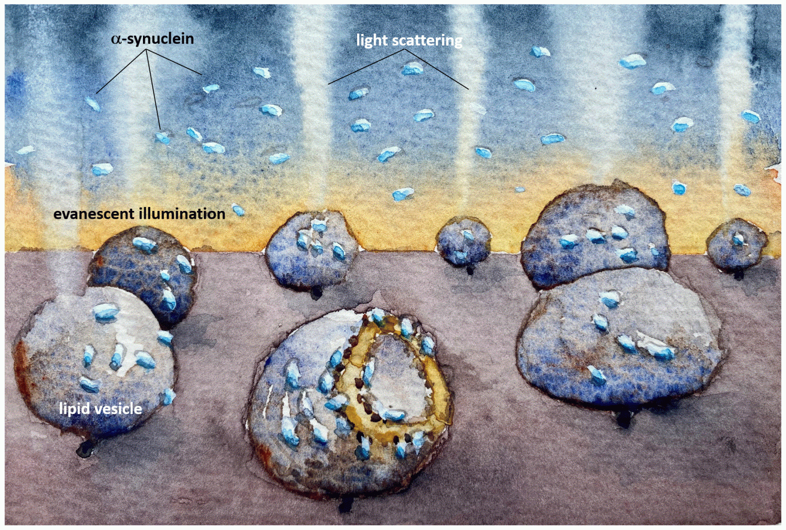 Màng Vesicle được quan sát bằng cách đo sự tán xạ ánh sáng và huỳnh quang từ các túi liên kết với bề mặt - và theo dõi sự thay đổi khi nồng độ thấp của α-synuclein được thêm vào.