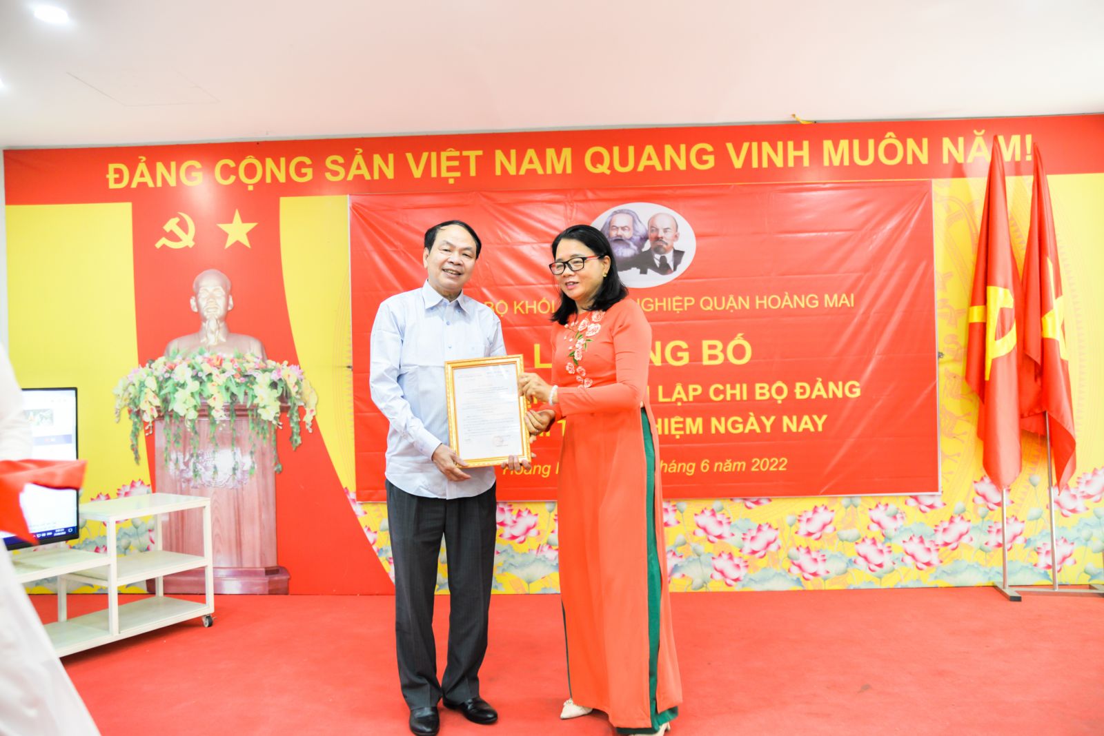 Đồng chí Lê Minh Sơn đón nhận Quyết định thành lập Chi bộ Tạp chí Thử nghiệm Ngày nay do đồng chí Lê Tuyết Hương, Bí thư Đảng ủy Khối doanh nghiệp quận Hoàng Mai chuyển trao. Ảnh TL