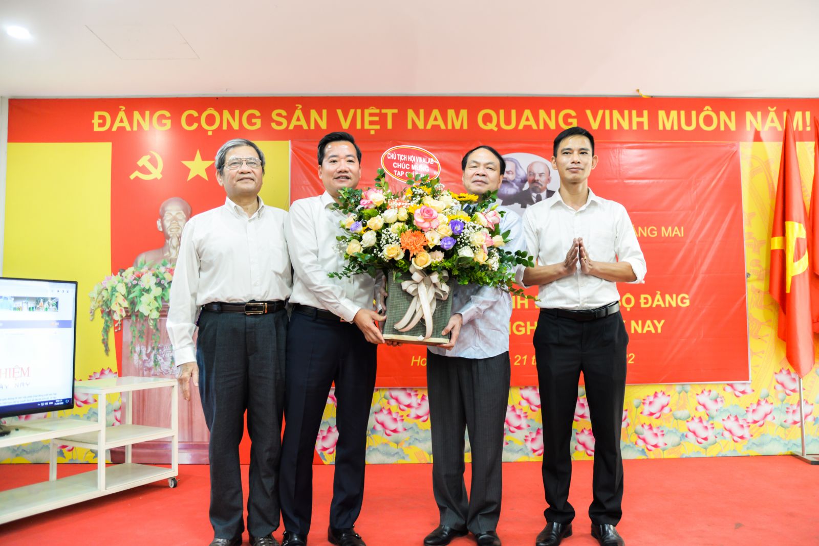Chủ tịch Hội VinaLab - TS. Nguyễn Hoàng Linh (Thứ 2 từ trái qua phải ảnh) chúc mừng Chi bộ Tạp chí Thử nghiệm Ngày nay. Ảnh TL