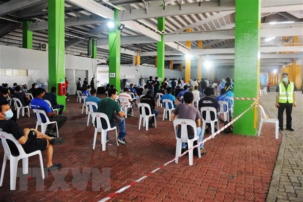 Công nhân xếp hàng chờ xét nghiệm COVID-19 tại Singapore ngày 10/6/2020.