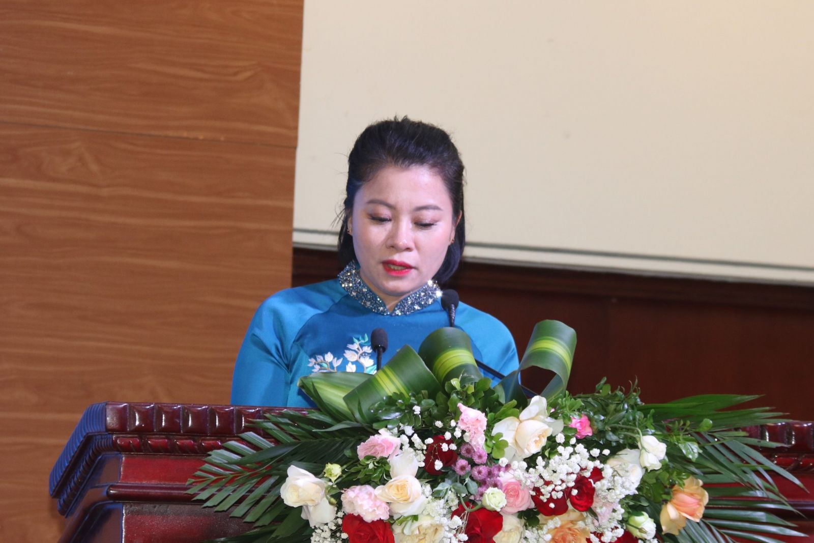 Bà Hoàng Thị Huệ, Bí thư chi bộ Trung ương Hội Khoa học Kỹ thuật Biển Việt Nam, Tổng biên tập Tạp chí Biển Việt Nam, phát biểu chào mừng tại buổi lễ.